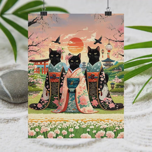 Moonlit Black Cat in Kimono – Japanese Cherry Blossom Art Print 🐾🌸🌙 -