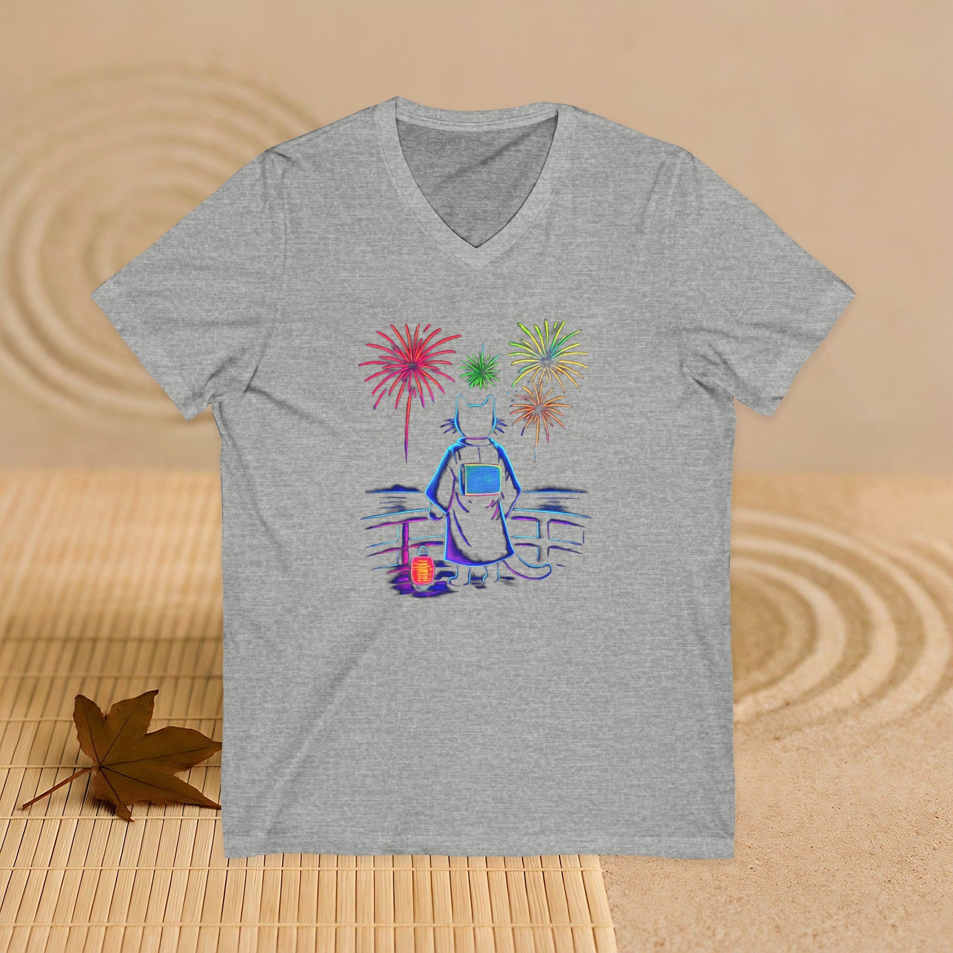 V-Neck Tee Cat Watching Fireworks - Unisex